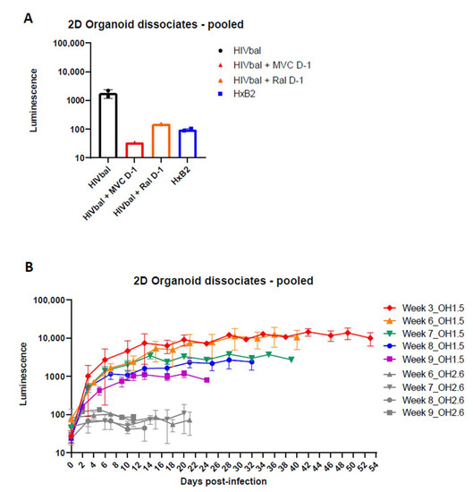 The 2D organoid dissociates and 3D organoids were infected overnight with 100 ng (p24 Gag) HxB2 (HxB2Luc), HIVbal, or HIVbalGFP. The next day, the medium was fully replaced and culture was continued in organoid differentiation medium with RA. For MVC and Raltegravir (RAL) treatment, 2D organoid dissociates and 3D organoids were treated with 200 nM MVC or 400 nM RAL for 2 h before infection. Following medium replacement, culture was continued in organoid differentiation medium with RA with 100 nM MVC or 200 nM RAL. To maximize viral infection, half of the medium was refreshed only 1× per week. All experiments were carried out in duplicate or triplicate. As a negative control for virus capture and release, we also generated empty Matrigel droplets using the same method as we use for embedding cerebral organoids: 30 uL droplets of matrigel (Corning, 356234) were made on indented parafilm and placed in the incubator (37 °C, 5% CO2) for 30 min to solidify. Matrigel droplets were then transferred to a 24-well plate and infected with the same protocol as for the 3D organoids.