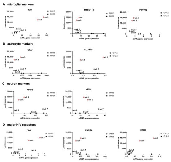 mRNA expression levels of microglia, astrocyte, and neuron markers and HIV receptors in 2D Organoid dissociates. (A) Microglia, (B) astrocyte, (C) neuron markers, and (D) HIV receptor expression levels were assessed by qRT-PCR and plotted against the highest luminescence value of corresponding 2D organoid dissociates. Red squares depict the organoid dissociates with the highest luminescence values. Cerebral organoids were derived from iPSC line OH1.5 or OH2.6. Gene expression was normalized to the reference gene ACTB.
