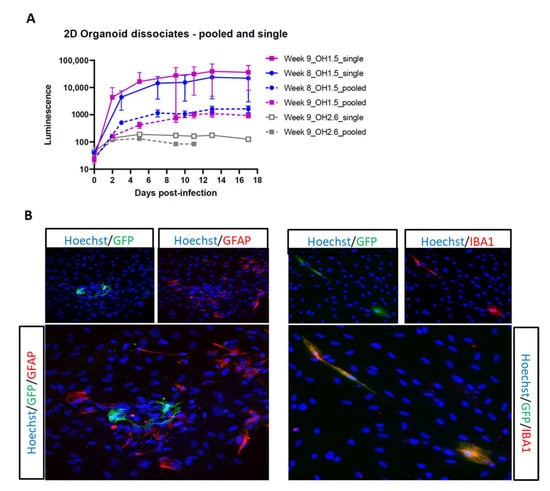 Optimization of 2D organoid dissociates HIV infection. (A) 2D organoid dissociates (OH1.5 and OH2.6), dissociated via the pooled and single method, were infected with HIVbal. Supernatant was collected at each timepoint and analyzed for luciferase activity. The means ± standard errors of the means are shown. (B) Double immunostainings of GFP combined with GFAP (astrocyte) and IBA1 (microglia) at day 7 post-infection of OH1.5 2D organoid dissociates with HIVbalGFP. All pictures were taken with a magnification of 20×.