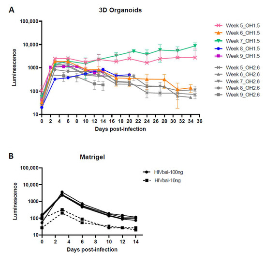 In addition to the aforementioned obstacles, we caution researchers of practical limitations when using luminescence as a readout for the viral infection of Matrigel-embedded organoids. We observed that Matrigel withholds viral particles and/or luciferase protein despite generous washing post-infection to remove unbound virus and remnants. Therefore, we highly recommend the use of additional methods, such as p24 ELISA, HIV RNA transcripts, and/or a fluorescently labeled viral vector to validate HIV infection. As more protocols are replacing Matrigel, we believe this will also facilitate the use of luciferase-tagged reporter viruses in the future, although it remains important to also assess the effects of these polymer scaffolds when using a luminescence-based readout system.