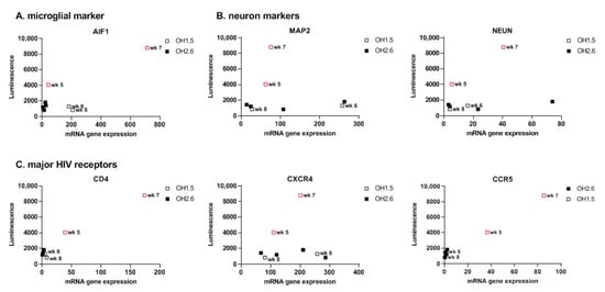 mRNA expression levels of microglia and neuron markers and HIV receptors in 3D Organoids. (A) Microglia and (B) neuron markers and (C) HIV receptor expression levels were assessed by qRT-PCR and plotted against the highest luminescence value of corresponding 3D organoid. Red squares depict 3D organoids with continued luminescence release. Cerebral organoids were derived from iPSC line OH1.5 and OH2.6. Gene expression was normalized to the reference gene ACTB.