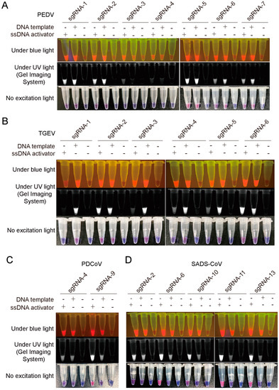 Screening of highly active sgRNAs for detection of PEDV, TGEV, PDCoV, and SADS-CoV. Identification of the highly active sgRNA targeting PEDV ORF3 gene (A), TGEV N gene (B), PDCoV N gene (C), and SADS-CoV N gene (D) by CRISPR/Cas12a cleavage assay; DNA template represents the amplification fragment of ORF3 or N gene as the template; ssDNA activator represents the complementary single-stranded DNA of the sgRNA. No excitation light stands for white light. PEDV, porcine epidemic diarrhea virus; TGEV, transmissible gastroenteritis virus; PDCoV, porcine deltacoronavirus; SADS-CoV, swine acute diarrhea syndrome coronavirus.