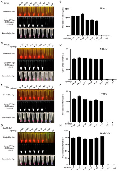 To further evaluate the sensitivity of the LAMP-Cas12a assay, we diluted the plasmid DNAs of PEDV-ORF3, TGEV-N, PDCoV-N, and SADS-CoV-N from 1 × 104 to 1 × 10−1 copies/μL. As shown in Figure 2A,C,E,G, the LoD for LAMP-Cas12a with the naked eye almost reached a single copy (tube 6), corresponding with the LoD of the multifunctional microplate reader (Figure 2B,D,F,H), which had a sensitivity a thousand times higher than that of the PCR-Cas12a assay (Figure S7).