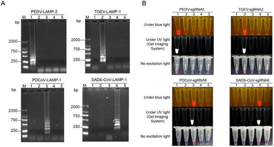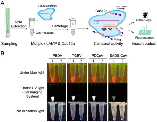 To address a coinfection scenario in actual production, a plasmid DNA mixture of PEDV, TGEV, PDCoV, and SADS-CoV (1:1:1:1) was amplified using multiplex LAMP with an optimized primer ratio. The multiplex LAMP reactions were incubated at 65 °C for 20 min and inactivated at 85 °C for 5 min. In addition, paraffin oil was added to the liquid surface to prevent evaporation and to control the temperature. The pipe cap reagent contained 1000 nM of sgRNA, 500 nM of the Cas12a protein, and 2 μL of NEBuffer 2.1. After the multiplex LAMP reaction, the CRISPR/Cas12a solution was centrifuged to observe the colorimetric/fluorescence readout. The amplicons were analyzed using the Cas12a cleavage reaction, incubated at 37 °C for 20 min, and inactivated at 98 °C for 2 min. The co-infected viruses were distinguished by different CRISPR/Cas12a assays.