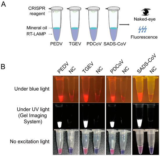 One-tube detection of four porcine coronaviruses in clinical samples based on CRISPR/Cas12a combined with RT-LAMP assay. (A) Diagram of principle of the contamination-free one-tube CRISPR/Cas12a combined with RT-LAMP assay detection of clinical samples. (B) Colorimetric/fluorescence readout of four porcine CoVs by one-tube multiplex RT-LAMP-Cas12a assay. CRISPR, clustered regularly interspaced short palindromic repeats; RT-LAMP, reverse transcription-loop-mediated isothermal amplification; No excitation light stands for white light; PEDV, porcine epidemic diarrhea virus; TGEV, transmissible gastroenteritis virus; PDCoV, porcine deltacoronavirus; SADS-CoV, swine acute diarrhea syndrome coronavirus; NC, negative control.