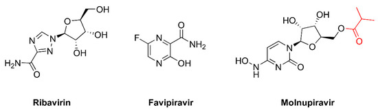 Favipiravir (6-fluoro-3-oxo-3,4-dihydropyrazine-2-carboxamide, T-705) (Figure 2) is an antiviral drug used in Japan to treat influenza. Favipiravir is a prodrug whose active form (favipiravir-ribofuranosyl-5′-triphosphate) mimics both guanosine and adenosine as substrates of viral RdRPs. It has a broad-spectrum antiviral effect, and, apart from influenza virus, favipiravir is also able to inhibit the replication of flavi-, alpha-, filo-, bunya-, arena-, noro-, and other RNA viruses, including neglected and (re)emerging viruses for which no antiviral therapy is currently available [123,124].