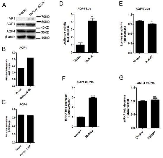 HuNoV transfection promotes AQP1 expression. (A–C). HuNoV transfection induced the expression of AQP1 in Caco2 cells. Caco2 cells were transfected with full-length HuNoV cDNA-expressing plasmid or empty vector for 24 h. The protein levels of AQP1, AQP4 and HuNoV VP1 were detected by WB (A) and quantified using Image J (B,C). (D,E). HuNoV promoted the activation of AQP1 promoter. Caco2 cells were co-transfected with empty vector or full-length HuNoV cDNA-expressing plasmid and AQP1-Luc or AQP4-Luc for 24 h. Cells were lysed and detected for the activity of Firefly luciferase. Values for the samples were expressed as a fold increase in the value induced in empty vector-transfected samples. (F,G). HuNoV promoted the transcription of AQP1. Caco2 cells were transfected with empty vector or full-length HuNoV cDNA-expressing plasmid for 24 h. Cells were harvested, and total RNA was extracted. The expression of AQP1, AQP4 and GAPDH genes was evaluated by relative real-time quantitative PCR. AQP1 and AQP4 mRNA copies were normalized using GAPDH and expressed as fold increase in the value for the empty vector (F,G). Data shown are mean ± S.D. of three independent experiments with each condition performed in triplicate. One representative experiment out of three is shown. * p < 0.05, ** p < 0.01, *** p < 0.001, ns, not significantly.