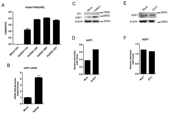 HuNoV infection promotes AQP1 expression. (A). HuNoV replicated in HIEs. HIEs were infected with HuNoV at a genome copy of 3.5 × 107. At the indicated time, the copies of HuNoV genome were evaluated by real-time quantitative PCR. (B–D). HuNoV induced the production of AQP1 at the mRNA and protein levels. HIEs were infected with HuNoV at a genome copy of 3.5 × 107. At 24 h post-infection, the expressions of AQP1 and VP1 were detected by WB (C) and quantified using Image J (D). The expression of AQP1 was evaluated by relative real-time quantitative PCR (B). (E,F). The enterovirus EV71 did not change the expression of AQP1. Caco2 cells were infected with EV71 at an MOI of 0.05 for 24 h, and the expression of AQP1 was subsequently detected by WB (E) and quantified using Image J (F). For graphs, data shown are mean ± S.D. of three independent experiments with each condition performed in triplicate. For images, one representative experiment out of three is shown. *** p < 0.001.