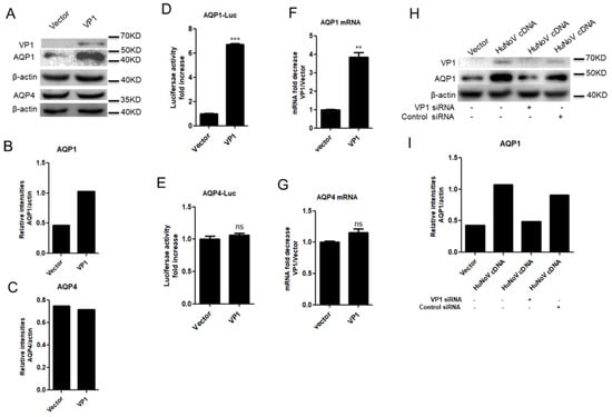 The genome of HuNoV is organized into three open reading frames (ORFs). ORF2 encodes the major capsid protein VP1, which can form virus-like particles (VLPs) []. Considering the important roles of VP1, we first assessed whether VP1 affects AQP1 expression. Caco2 cells were transfected with VP1-expressing plasmid for 24 h. The results indicated that HuNoV VP1 promoted the production of AQP1 in Caco2 cells (Figure 3A–C). HuNoV VP1 also promoted the expression of AQP1 but not AQP4 at both the promoter (Figure 3D,E) and mRNA (Figure 3F,G) levels. The induction of AQP1 expression by HuNoV was blocked when VP1 was knocked down by a VP1-specific siRNA (Figure 3H,I), further indicating the important role of VP1 in HuNoV-mediated AQP1 expression. These results collectively indicated that HuNoV VP1 promotes the expression of AQP1.