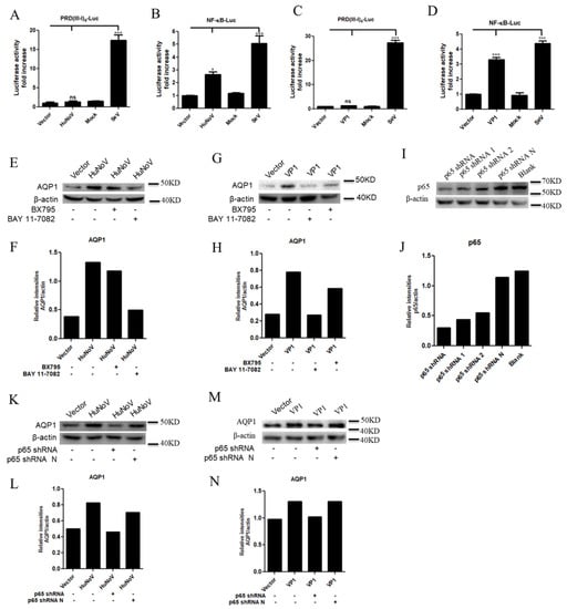 HuNoV promotes AQP1 expression through NF-κB signaling pathway. (A,B). HuNoV promoted the activation of NF-κB-responsive promoter. (C,D). VP1 promoted the activation of NF-κB-responsive promoter. Caco2 cells were transfected with PRD(III-I)4-Luc or NF-κB-Luc for 4 h followed by stimulation with or without 100 HAU mL−1 SeV, or co-transfected with empty vector, full-length HuNoV cDNA (A,B) or VP1 (C,D)-expressing plasmid and PRD(III-I)4-Luc or NF-κB-Luc. (E–H). HuNoV and VP1 promoted the expression of AQP1 through NF-κB signaling pathway. Caco2 cells were transfected with empty vector or full-length HuNoV cDNA (E) or VP1 (G)-expressing plasmid. The inhibitor BX795 or BAY 11-7082 were added at 4 h post-transfection. At 24 h post-transfection, the expression of AQP1 was detected by WB (E,G) and quantified using Image J (F,H). (I–N). p65 knockdown blocked HuNoV or VP1-induced AQP1 expression. Caco2 cells were transfected with or without different p65 specific shRNA or control shRNA (p65 shRNA N) (I,J). The knockdown effect of p65 shRNA was detected by WB (I) and quantified using Image J (J). p65 specific shRNA or p65 shRNA N was chosen to be transfected into Caco2 cells. At 24 h post-transfection, cells were transfected with empty vector or full-length HuNoV cDNA (K) or VP1 (M)-expressing plasmid for 24 h. The expression of AQP1 was detected by WB (K,M) and quantified using Image J (L,N). Data shown are mean ± S.D. of three independent experiments with each condition performed in triplicate. One representative experiment out of three is shown. * p < 0.05, *** p < 0.001, ns, not significantly. N, negative control.