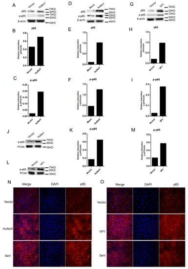 The p65 subunit is a major component of NF-κB complexes, which is responsible for trans-activation of gene expression []. To further address the underlying mechanism of HuNoV interaction with the NF-κB signaling pathway, Caco2 cells were transfected with the full-length HuNoV cDNA for 24 h to assess the interaction of HuNoV with p65. The results showed that the expression and phosphorylation of p65 were induced after cells were transfected with the full-length HuNoV cDNA (Figure 5A–C), which were further confirmed in the context of HuNoV infection (Figure 5D–F). Likewise, HuNoV VP1 also promoted the expression and phosphorylation of p65 (Figure 5G–I). In most cell types, NF-κB dimers are usually inactivated and kept in the cytoplasm. Only when NF-κB was activated and translocated into nucleus, the transcription of genes could be mediated by NF-κB []. We next examined whether HuNoV induces the nuclear translocation of p65. Caco2 cells were transfected with the full-length HuNoV cDNA or VP1 for 24 h. Cells were collected to isolate nuclear proteins for WB assay (Figure 5J–M) or used to observe the location of p65 by IFA (Figure 4N,O). The results showed that phosphorylated p65 in the nucleus was obviously increased in HuNoV-transfected cells (Figure 5J,K,N), VP1-transfected cells (Figure 5L,M,O), or SeV-infected cells (Figure 5N,O). These results collectively indicated that HuNoV and VP1 activates the NF-κB signaling pathway by inducing the expression, phosphorylation and nuclear translocation of p65.
