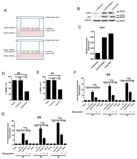 To address the physiological relevance of HuNoV-induced AQP1 expression, we constructed a human intestinal epithelial barrier (IEB) to detect the effect of HuNoV on its transepithelial electrical resistance (TEER). TEER value is a widely accepted quantitative indicator of the integrity of IEB [,,,]. Considering its polarized characteristic, Caco2 cells were commonly chosen to construct the human IEB system [,,,,]. The model of IEB using Caco2 cells in this study is shown in Figure 6A. Due to very low transfection efficiency in IEB, we constructed HuNoV and VP1-expressing lentivirus, respectively, for transduction. Firstly, the expression of AQP1 was detected after transduction with a recombinant lentivirus carrying HuNoV (named lenti-HuNoV) or VP1 (named lenti-VP1). The induction of AQP1 expression was observed after transduction with lenti-HuNoV or lenti-VP1 (Figure 6B,C). Moreover, following transduction with lenti-HuNoV (Figure 6D) or lenti-VP1 (Figure 6E), the TEER value of IEB significantly decreased compared to that with the empty lentivirus, indicating that the integrity of IEB was likely abrogated by HuNoV and VP1. We next assessed whether HuNoV or VP1 affected the permeability of IEB using small molecule FITC-conjugating dextran (FITC-dextran). The results showed that HuNoV (Figure 6F) and VP1 (Figure 6G) enhanced the penetration of FITC-dextran through IEB, which was significantly blocked when the AQP1 channel was inhibited by Bacopaside II. These results together indicated that HuNoV increases the permeability of IEB and that HuNoV-mediated enhancement of small molecule permeability is associated with the AQP1 channel.