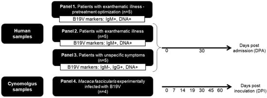 Panel 4. Since the timing of infection of the patients is unsure, we included serial serum and bone marrow samples from four cynomolgus monkeys (Macaca fascicularis), experimentally infected with B19V (encoded as Cy01 to Cy04) to accurately determine the time of infection and correlate it with B19V DNA levels. These animals were clinically healthy, young adults (weighing 3–5 kg), ranging in age from three to four years old from the Department of Primatology, Institute of Science and Technology in Biomodels (Fiocruz), as described by Leon et al. [18]. These samples collected at 7, 14, 19, 30, 45 and 60 days post B19V inoculation (dpi) were stored at −70 °C in the LADTV-IOC/Fiocruz biorepository until the beginning of this study [18] (Figure 1).