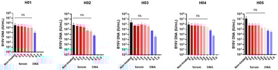Serum samples (H01-H05) from five patients with acute B19V infection were pretreated with Benzonase®, and viral DNA was then extracted from these samples and subjected to qPCR analysis.