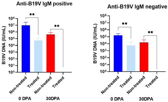 Performance of Benzonase® pretreatment in serial serum samples collected from patients with anti-B19V IgM positive and negative. IU/mL: International Units per milliliter; DPA: Days post-admission; ** p-value < 0.01.