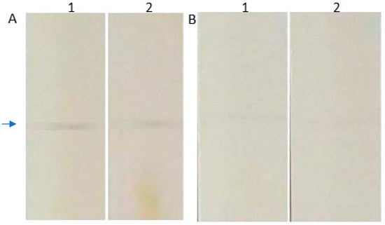 We used a modified MAPIA (multi-antigen print immunoassay) to evaluate if there were viral particles in serum samples in which the genome titer remained detectable after benzonase pretreatment. This assay consists of a thin layer of immobilizated antigen or antibody onto nitrocellulose membrane by micro-printing, without denaturing conditions, followed by a standard chromogenic immunoassay [21]. In this case, mouse IgG anti-B19V VP1 monoclonal (1:1.200) (Abcam Inc., Waltham, MA, USA) was micro-printed to a nitrocellulose membrane using semi-automatic printing equipment (CAMAG automatic TLC sample 4, CAMAG, Muttenz, Switzerland). The membranes were incubated (37 °C, 30 min) with 1mL of blocker buffer PBS-milk (0.5% skimmed milk (w/v) in PBS). After that, the membrane was washed (3-fold) with PBS-Tween 20 (0.05%) (PBST) and incubated (37 °C, 30 min) with serum, diluted in PBST (1:100), H09 (0 dpa; B19V-DNA negative after benzonase pretreatment) and H10 (0 dpa; B19V-DNA positive after Benzonase® pretreatment). After washing (3-fold, 37 °C, 5 min) with PBST, the membranes were incubated (37 °C, 1 h) with the mouse anti-B19V VP1 monoclonal (1:1.200). After the washing step, the conjugate (Goat IgG anti-mouse with peroxidase; 1:1.200) was added and incubated (37 °C, 30 min). After an additional washing step (3-fold), the immune complex was revealed with diaminobenzidine in citrate/phosphate buffer, pH 5.0, 30% H2O2. The membranes were rinsed in purified water at room temperature to stop the reaction. The strips were dried to be analyzed.