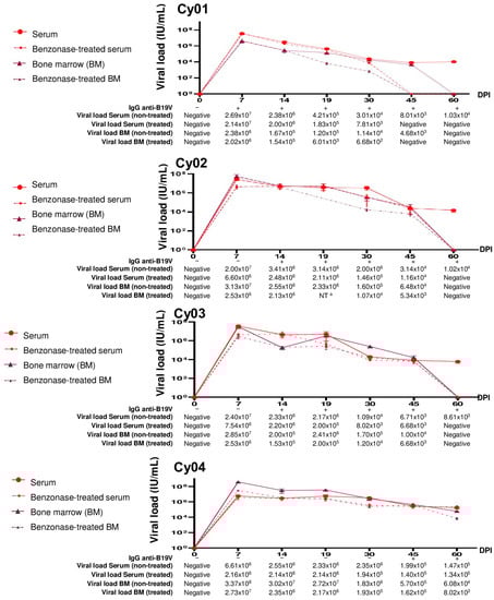 From 30th dpi, a reduction in viral loads was seen in serum and bone marrow samples after Benzonase® treatment compared with nontreated samples, indicating that “naked” and encapsidated B19V DNA coexist until the 60th dpi. At this point, the DNA from the infectious virions was no longer detectable. For Cy04, as seroconversion occurred only at the 45th dpi, B19V DNA remained detectable after endonuclease treatment, demonstrating the longest presence of infectious virions.