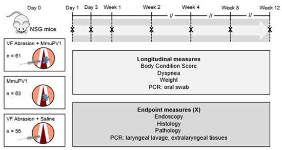 Mice underwent 1 of 3 treatments: (1) vocal fold abrasion and MmuPV1 infection, (2) infection only, or (3) abrasion and mock infection. Two cages (1 per sex) of 3–5 mice each were sacrificed on days 1 and 3 and weeks 1, 2, 4, 8, and 12 post treatment. In addition, 2 cages (1 per sex) underwent mock infection without abrasion and were sacrificed at week 12, and 2 cages served as naïve controls. Data and samples were collected weekly and at endpoints as depicted in Figure 1. We compared measures of laryngeal MmuPV1 infection and disease pathogenesis between mice that underwent vocal fold abrasion and mice whose larynges were uninjured. Mice that underwent vocal fold abrasion and mock infection were included to control for the effect of wound healing on health outcomes and tissue pathology.
