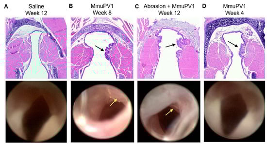Gross and microscopic murine vocal fold lesions post MmuPV1 infection. H&E-stained histologic and endoscopic images of vocal folds from the same animal. (A) Week 12 post saline mock infection. (B) Week 8 post MmuPV1 infection. Arrows indicate grossly visible, smooth vocal fold lesion. (C) Week 12 post vocal fold abrasion and MmuPV1 infection. Arrows indicate grossly visible, smooth, pale vocal fold lesion. (D) Week 4 post MmuPV1 infection. Arrow indicates lesion on histology. Lesion was not visible on endoscopy.