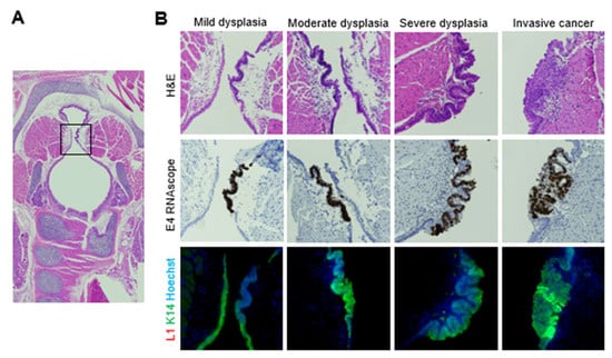 MmuPV1-induced vocal fold dysplasia was positive for E4 transcript and negative for L1 capsid protein, regardless of severity. (A) Low magnification of H&E-stained coronal section of murine larynx. Box indicates vocal folds. (B) Serial sections of mild, moderate, and severe vocal fold dysplasia stained with H&E, MmuPV1 E4 RNAscope ISH, and MmuPV1 L1/K14 IF. 40×.