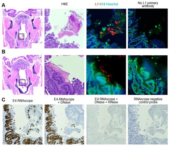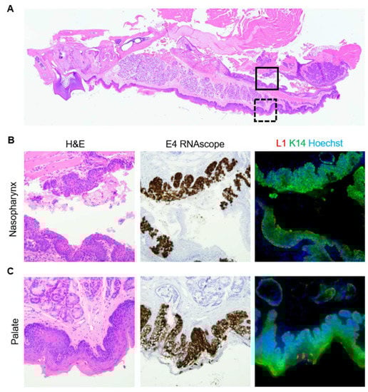 All hypopharynx disease was positive for both MmuPV1 E4 transcript and L1 capsid protein (Figure S9A,B). As previously shown [54,55], tongue and palate dysplasias were positive for transcript and capsid protein (Figure S9C–F). In the palate, only diseased stratified squamous epithelium on the oropharyngeal side was positive for L1. As in the larynx, the diseased respiratory epithelium of the nasopharyngeal side was positive for transcript, but negative for capsid protein (Figure 9).