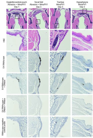 Subclinical MmuPV1 infections in larynx, trachea, and hypopharynx day 1 and 3 after infection. Low magnification of H&E-stained coronal sections of murine larynx and 40× magnifications of areas indicated in boxes with serial sections stained with H&E, MmuPV1 E4 RNAscope ISH, E4 RNAscope with DNase treatment, E4 RNAscope with DNase and RNase treatment, and negative control probe RNAscope ISH.