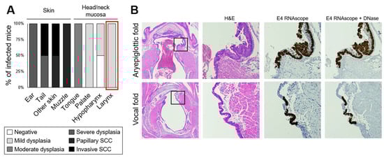 Secondary laryngeal MmuPV1 infections and dysplasias in nude mice arose after skin infection with laryngeal lavage. (A) Disease severity in nude mice infected with laryngeal lavage. SCC: squamous cell carcinoma. (B) Low magnification of H&E-stained sections of murine larynges and 40× magnification of areas indicated with boxes, with serial sections stained with H&E, MmuPV1 E4 RNAscope ISH, and E4 RNAscope with DNase treatment.