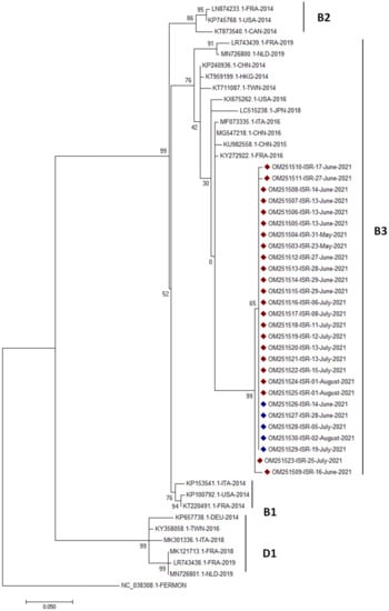 Sequence analysis of 280 nucleotides of the VP1 gene from 28 EV-D68 positive patient and sewage samples showed very close similarity between all samples. The sequences derived from those samples were compared to reference strains that represent a collection of EV-D68 sequences from previously reported world outbreaks during 2014–2020 []. The phylogenetic analysis indicated that all local samples were of subclade B3 (Figure 2).