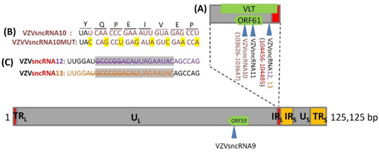 - Markus, A.; Golani, L.; Ojha, N.K.; Borodianskiy-Shteinberg, T.; Kinchington, P.R.; Goldstein, R.S. Varicella-Zoster Virus Expresses Multiple Small Noncoding RNAs. J. Virol. 2017, 91, e01710-17. [Google Scholar] [CrossRef] [PubMed]