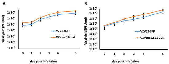 3.2. Growth Rates of VZVsnc10MUT and VZVsnc12-13DEL Are Similar to Those of Their Parental Virus in ARPE-19 Cells