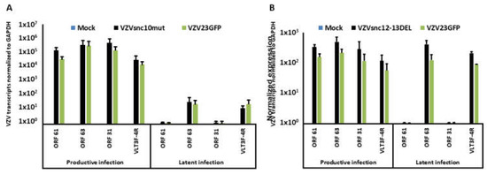 Both mutation strategies resulted in BACs that yielded viable VZV. Initial characterization of the mutant VZV was performed by infecting ARPE19 cells with each virus, extracting RNA at 5 dpi, and subjecting it to Taqman stem-loop quantitative reverse transcriptase PCR (SL-qRT-PCR) for the sncRNA, using primers matching the native and mutated sequences [13]. As expected, VZV sncRNAmut10 infected cells did not show any expression of VZVsncRNA10, while cells infected with VZV derived from the parental BAC showed strong expression (Figure 2A). In addition, stem-loop primers directed to the mutated sequence did not result in PCR amplification from RNA of cells infected with the mutant virus (or the parent virus) suggesting that either the mutated sequence was not expressed as an alternative sncRNA or that it was rapidly degraded in the host cells. Similar assays of RNA from cells infected with VZVsnc12-13DEL indicated complete abrogation of expression of both VZVsncRNA12 and VZVsncRNA 13 compared to parent control virus when sncRNA12 and 13 specific primers were used (Figure 2B), and these also detected abundant levels in another pOka-derived virus, VZV66GFP (Figure 2 and Refs. [13,14]).