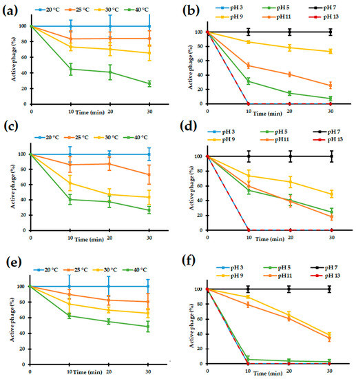 (a,b) Bolek, (c,d) Lolek, and (e,f) Tola phage stability under various temperatures and pHs. Temperatures and pHs are indicated according to the legends.
