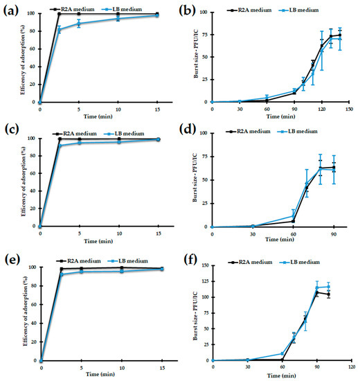 In order to verify whether the media richness influenced the effectiveness of the adsorption and propagation of the Bolek, Lolek, and Tola phages, we performed adsorption and one-step growth assays in both LB and R2A media. Due to the poor visibility of the Bolek and Lolek plaques formed on their host lawns cultivated on LB medium (see Section 3.2.1), plaque assays used to estimate the adsorption kinetics and one-step growth of the Bolek and Lolek phages were carried out on R2A double agar plates.