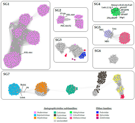 Another subgraph, SG4, creates a dense clique of phages assigned to the Melnykvirinae subfamily, among which the majority of known Autographiviridae phages infecting Aeromonas (17) were located. It is worth noting that these Aeromonas autographiviruses were isolated from seven geographically distant places (Australia, India, Mexico, China, Poland, Taiwan, and South Korea, Table S1).