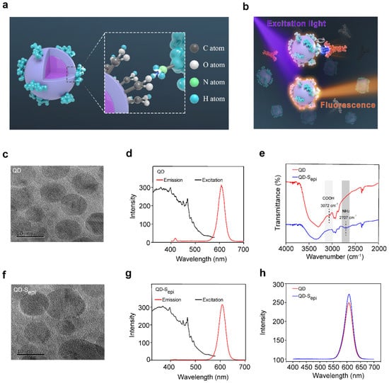 Schematic illustration of QD-peptides detection for the corresponding antibody. (a) Schematic of QDs coupled with peptides. The peptides are marked in cyan. (b) A schematic diagram of the fluorescent QD-peptides biosensor identifies antibodies by the quantitative fluorescent quenching signal. Purple represents excited light, and orange represents emitted light. TEM (c) and emission and excitation spectra (d) of the QDs. TEM (f) and emission and excitation spectra (g) of the QDs coupled with an epitope from receptor-binding-domain (RBD) of SARS-CoV-2 S proteins (Sepi). (e) FTIR spectra of the QDs (red line) and QDs coupled with Sepi (blue line). The carboxyl peak (COOH; 3072 cm−1) is shown in light grey and the amino peak (NH2; 2707 cm−1) is in dark grey. (h) Fluorescence intensity of QDs (red line) and QDs coupled with Sepi (blue line). Sepi: Sepi1 (aa491–505).