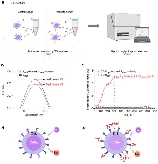 Compared with full-length proteins, epitopes are the targeted structures recognized by B cells to produce antibodies and are also the basis of the specificity of the immune response. The specificity can be significantly amplified by using epitopes as diagnostic antigens []. However, due to the small size of the peptides, a comparable carrier or medium to carry the peptides is a critical factor that determines the diagnostic quality []. Quantum dots (QDs) are inorganic semiconductor nanomaterials with high quantum efficiency, good photochemical stability, and controllable fluorescence properties []. Compared with conventional fluorescent dyes (<5 ns), such as SYBR Green, QDs have a high photobleaching resistance (100- to 1000-fold) and a longer excited-state lifetime (10–40 ns) []. QDs can be easily modified by biomolecules, allowing them to be a qualified carrier for various substrates [,]. Fluorescent QDs and peptides can match each other’s size on the nanometer scale and have been applied to a variety of biological detections; for example, QDs with cell-penetrating peptides can monitor lysosomal pH fluctuations [], QDs with histone-containing peptides can mark E. coli [], and QDs with glutathione can detect levodopa concentrations in vivo []. Nevertheless, whether QDs can be a rapid and sensitive detection method for the SARS-CoV-2 diagnosis is unknown.