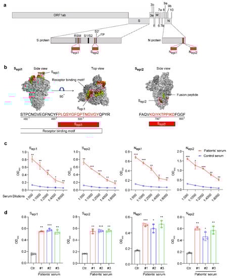 Identification of the antigenic epitopes of SARS-CoV-2 S and N proteins. (a) Schematic of the genomic structure of SARS-CoV-2. Different grey boxes represent different ORFs. The epitopes are marked in red. (b) Visualization of the trimeric S protein of SARS-CoV-2 based on PDB 6VYB using PyMOL. Sepi1 and Sepi2 are marked in red. Receptor binding motifs and fusion peptides are marked in cyan. (c) The reaction of a COVID-19 antibody-positive patient’s serum (red curve) and an uninfected human serum (blue curve) at different dilutions of the four peptides by ELISAs. (d) Reaction of 3 COVID-19 antibody-positive patients (#1, red; #2, blue; and #3 green) and uninfected human serum(black) to the four peptides by ELISA. The serum was diluted at 1:2000 (except for patient serum #1 tested with Nepi2, which was diluted at 1:4000). All data are presented as the mean ± SD from triplicate measurements. All statistical analyses were carried out with unpaired t-tests for each experiment (* p < 0.05, ** p < 0.01, *** p < 0.001).