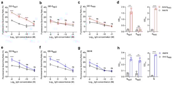 QDs coupled with four highly sensitive SARS-CoV-2 peptides efficiently respond to the corresponding antibody. (a–c) Reactivity of QDs coupled with Sepi1 (a), Sepi2 (b), and SRBD (c) to the anti-SRBD antibody (red) and anti-N antibody (black). (d) Reactivity of Sepi1, Sepi2, and SRBD to the anti-SRBD antibody (red) and anti-N antibody (black) by ELISAs. (e–g) Reactivity of QDs coupled with Nepi1 (e), Nepi2 (f), and the recombinant N protein (g) to the anti-N antibody (blue) and anti-SRBD antibody (black). (h) Reactivity of Nepi1, Nepi2, and the recombinant N protein to anti-N antibody (blue) and anti-SRBD antibody (black) by ELISAs. All values represent the means ± SD of three independent experiments. Statistical analyses were carried out with unpaired t-tests for ELISAs and two-way ANOVA for fluorescence quenching ratio comparisons. * p  <  0.05, **p  <  0.01, *** p  <  0.001, **** p  <  0.0001, ns, non-significant.