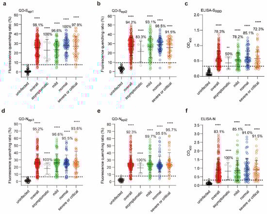 Consistent with S peptides, QD-N peptides also showed higher sensitivity. The overall sensitivity for QD-Nepi1 is 95.2% (Figure 5d, red dots) and 92.3% for QD-Nepi2 (Figure 5e, red dots), while that for N-based ELISA is only 83.1% (Figure 5f, red dots). Significantly, we noticed that QD-Sepi1 reached 100% positive in asymptomatic (Figure 5a, grey dots) and normal severity populations (Figure 5a, blue dots), supporting the high sensitivity of the QD-peptides biosensor.
