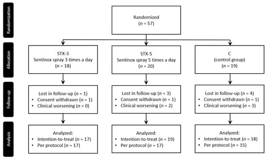 From 20 May to 9 November 2021, a total of 57 patients were enrolled. All 57 patients were randomized and allocated to groups STX-3 (n = 18), STX-5 (n = 20) and C (n = 19). There were three consent withdrawals (one in each group). A total of five patients (2 in group STX-5 and three in group C) terminated the participation earlier due to the worsening of clinical conditions. Therefore, the final ITT population included 54 (17, 19 and 18 in groups STX-3, STX-5 and C, respectively) patients, while the PP population included 49 patients (17, 17 and 15 in groups STX-3, STX-5 and C, respectively) (Figure 1).