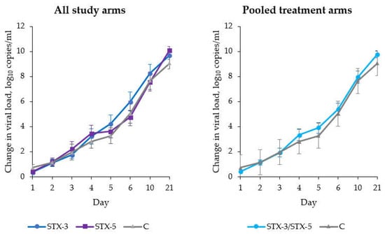 As reported in Figure 2, there was a constant (p < 0.0001) decay in viral loads independently of the ITT study arm. The overall effect of treatment was not significantly (p = 0.95) different from group C. However, though non-significant, by the end of treatment on day five, patients in group STX-3 showed a 1.02 (95% CI: −0.35–2.40; p = 0.14) log10 reduction in viral load, as compared with group C. The corresponding log10 reduction in the STX-5 group was 0.18 (95% CI: −1.19–1.54; p = 0.80). The effects of viral load at screening (p = 0.26) and time-per-treatment interaction (p = 0.59) were not statistically significant. Similar results were observed in the PP population (Supplementary Material, Figure S2).