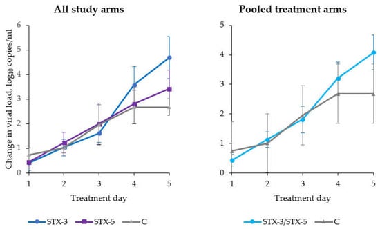 A visual inspection of the distribution of viral loads at t0 identified several influential points (outliers), and all of these had high viral loads (Ct < 20). For this reason, a stratified analysis was conducted by dividing subjects on the basis of Ct values at screening into two categories, namely medium (Ct 20–30) and high (Ct < 20) viral loads. However, it was possible to conduct the inferential analysis only for medium viral load samples, as the number high viral load samples was insufficient. As shown in Figure 3, when only including subjects with medium viral loads (n = 39, 13 in either group), the efficacy of STX was more pronounced in both treatment arms. In particular, on the last day of treatment (day five), compared with group C, subjects in the STX-3 group showed a significant (p = 0.016) 2.01 (95% CI: 0.37–3.65) log10 reduction in viral loads. The corresponding reduction (0.53; 95% CI: −1.13–2.18) in the STX-5 group was not statistically significant (p = 0.53).