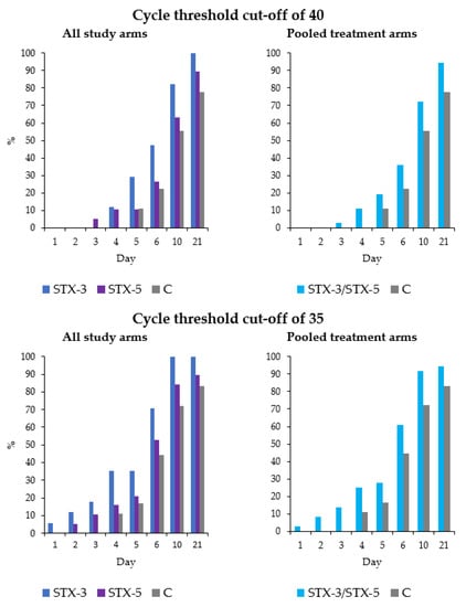 For the secondary efficacy endpoint, the study groups were compared in terms of negativization by using two different cut-offs. As shown in Figure 4, the negativization was faster in both treatment arms than in group C. In particular, by the end of treatment (day five), the proportion of negativized subjects (Ct > 40) was 29%, 11% and 11% in the STX-3, STX-5 and C groups, respectively. By applying the Ct cut-off of 35, the corresponding percentages were 35%, 21% and 17%, respectively. As demonstrated by the Cochran–Mantel–Haenszel test, the proportion of negativized subjects in group STX-3 vs. group C was significantly higher by applying both >40 and >35 Ct value-based cut-offs with RRs of 1.62 (95% CI: 1.23–2.15) and 1.65 (95% CI: 1.31–2.08), respectively. Although not statistically significant, a similar trend was observed for the comparison of groups STX-5 and C [Ct > 40: RR 1.23 (95% CI: 0.91–1.66); Ct > 35: RR 1.22 (95% CI: 0.96–1.56)]. Finally, when both treatment arms were pooled, the general association proved significant independently from the Ct value cut-off considered [Ct > 40: 1.41 (95% CI: 1.08–1.85); Ct > 35: RR 1.43 (95% CI: 1.14–1.78)]. Similar results were obtained in the PP population (Supplementary Material, Figure S3).