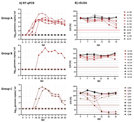 Serum samples of 0, 7, 14, 21, 28 and 42 dpi were screened for BTV-group-specific antibodies (VP7) using a competitiveELISA (ID Screen® Bluetongue Competition, ID-Vet, France) and plate reader reading at a wavelength of 450 nm according to the manufacturer’s instructions. The results were expressed as the percent of negativity compared to the negative kit control (% S/N = optical density (OD) of the sample/OD of the negative control multiplied by 100) and denoted as a positive or negative result (<50% S/N were considered as positive, samples with ≥50% S/N as negative).
