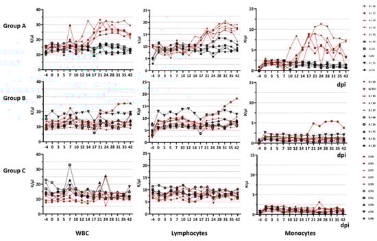 42]. Hence, our 6-month-old goats in the animal trial showed higher WBC counts than adults, but the values are comparable to those of the 3-month-old goats described in the literature. Nevertheless, the goats infected with atypical BTV strains developed a significant increase in WBCs over the course of infection, which can be constituted as leukocytosis from approx. 17 dpi until the end of the animal trial at 42 dpi. In detail, we observed lymphocytosis and monocytosis in all of the viraemic animals infected with the atypical strains. BTV infection was previously described to be followed by pan-leukopenia, with its peak at 7–8 dpi [
