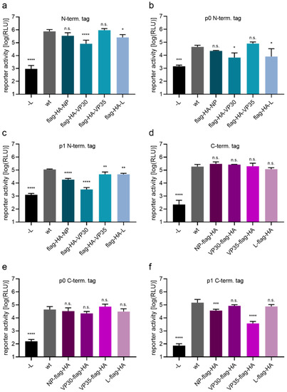 Functionality of flag-HA tagged EBOV proteins. (a–c) N-terminal tagging of RNP proteins. 293T cells were transfected with all necessary plasmids for a 1- or 4-cis minigenome assay, encoding either untagged RNP proteins (wt) or flag-HA-tagged version as indicated. As a negative control the polymerase L was omitted and replaced by empty vector (-L). Reporter activities in a 1-cis minigenome assay (a) or p0 cells (b) or p1 cells (c) of a 4-cis minigenome assay are shown. (d–f) C-terminal tagging of RNP proteins. 293T cells were transfected as described in (a–c). Reporter activity in a 1-cis minigenome assay (d) or p0 cells (e) or p1 cells (f) of a 4-cis minigenome assay are shown. Means and standard deviation of four (a,d–f) or three (b,c) biological replicates are shown. Significant differences compared to wt are indicated: n.s.: not significant; *: p < 0.5; **: p < 0.01; ***: p < 0.001; ****: p < 0.0001.