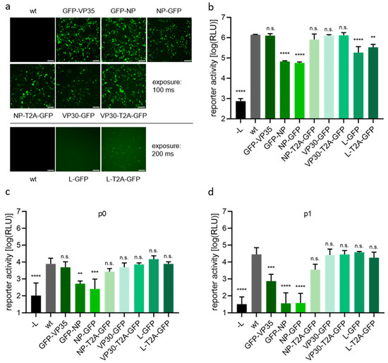 Characterization and functionality of GFP-tagged EBOV RNP proteins. (a) Visualization of fluorescence. 293T cells were transfected with all components for a 4-cis minigenome assay. Indicated expression plasmids of RNP proteins were replaced by expression plasmids encoding RNP proteins directly tagged with GFP or proteins GFP-tagged via a T2A site. 48 h after transfection expression of GFP was analyzed by fluorescence microscopy. Scale bar: 100 µm. (b) Analysis of protein functionality in a 1-cis minigenome assay. 293T cells were transfected with all components for a 1-cis minigenome assay, including expression plasmids for tagged RNP proteins instead of wild type (wt) proteins as indicated. Cells were lysed 48 h after transfection, and minigenome reporter activity was measured. As a negative control, expression plasmid for L was omitted (-L). (c,d) Analysis of protein functionality in a 4-cis minigenome assay. 293T cells were transfected with all components for a 4-cis minigenome assay. Lysis and measurement of reporter activity in p0 cells (c) was performed 72 h after transfection, while p1 cells were assessed 72 h after infection (d). The polymerase expression plasmid was replaced by empty vector as a negative control (-L). Means and standard deviations of three biological replicates (b–d) or a representative of three biological replicates (a) are shown. Significant differences compared to wt are indicated: n.s.: not significant; **: p < 0.01; ***: p < 0.001; ****: p < 0.0001.