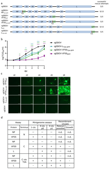 Characterization of GFP- and T2A-GFP-tagged recombinant EBOV. (a) Overview of genome structure of recombinant EBOV constructs encoding GFP as a reporter used for rescue attempts. (b) Growth kinetics of rescued viruses. 293T cells were infected with 1 × 104 TCID50 of either GFP-tagged, GFP via a T2A-site tagged (as depicted), or untagged (rgEBOV) recombinant viruses. The lower limit of detection is indicated by a dotted line. Means and standard deviations of three biological replicates are shown. Significant differences compared to wt are indicated: n.s.: not significant; **: p < 0.01; ****: p < 0.0001. (c) Visualization of reporter activity. GFP-signals in the experiment described in (b) were visualized by fluorescence microscopy at depicted time points (scale bar 100 µm). (d) Summary of minigenome (from Figure 3) and virus data for comparison. Symbols indicate whether results were comparable to the positive control or wild type (+; no significant reduction in reporter activity or mean reduction in titers in growth kinetics), slightly reduced (-; significant but less than 1 log reduction in reporter activity or mean reduction in titers in growth kinetics), or highly reduced (--; more than 1 log reduction in reporter activity or mean reduction in titers in growth kinetics, or rescue not possible). p: passage; n.d.: not done.