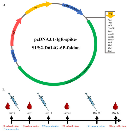 Vaccine construct and immunization timeline. (A) DNA construct encoding IgE-spike-S1/S2-D614G-6P-foldon. (B) Study scheme: timeline of immunization and blood collection.