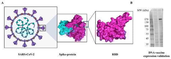 DNA vaccine that encodes SARS-CoV-2 S-protein ectodomain was designed and optimized (Figure 1A). The complete sequence of DNA vaccine is given in Supplementary File S2. For the validation of antigen expression, the synthesized DNA construct was transfected into HEK-293T cells. As a result, a protein with a molecular weight of about 170 kDa was successfully expressed and secreted into the cell supernatant (Figure 2).